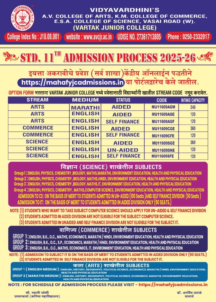 IF You ARE allotted A. V. Junior College Vasai Rd. (West)in the merit list for F.Y.J.C. (11th) THEN To confirm your admission, you have to do the following steps.